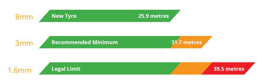 Source: Tests were carried out by independent experts, the Motor Industry Research Association, in 2003 and 2004 on four different vehicles: a mid-range family hatchback, an MPV, executive saloon and a high-performance saloon car. Depth of water controlled to 0.5mm to 1.5mm, on an asphalt road surface. Maximum braking force applied from a speed of 50mph. Tyres were tested at four different tread depths – 8mm (new), 5mm, 3mm and 1.6mm.